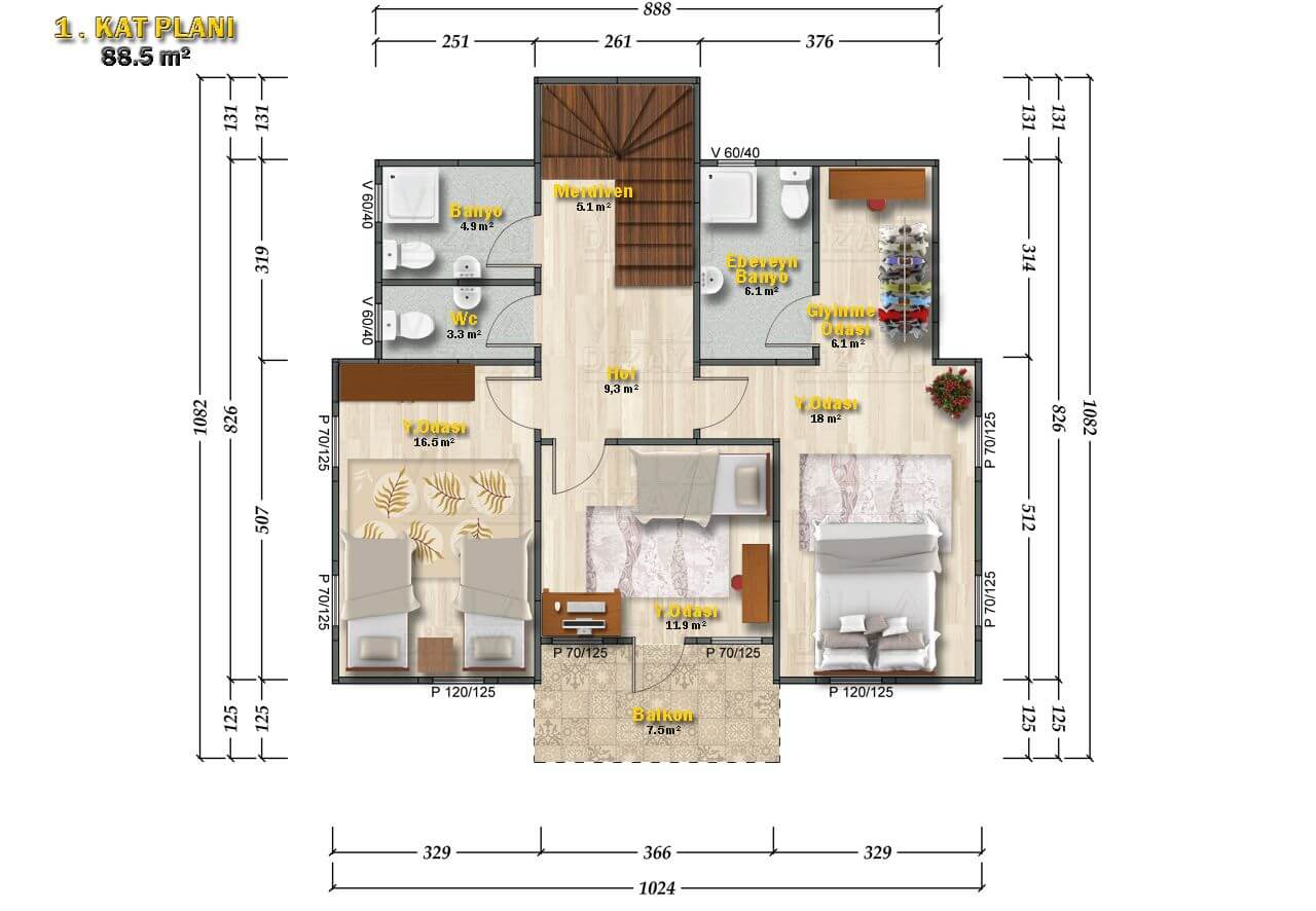 Üst katta ise çekirdek aile yapısında sıyırılmış dede ve torunların aynı çatı altında kaldığı modelin yerleşimini görmekteyiz.